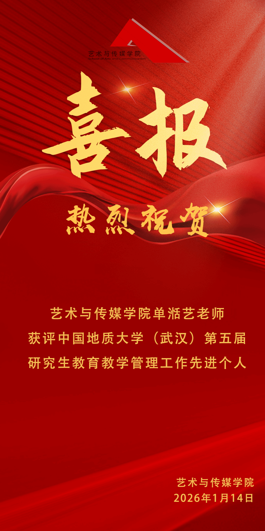 喜报 | 热烈祝贺我院单湉艺老师获评Bwin官网第五届研究生教育教学管理工作先进个人!