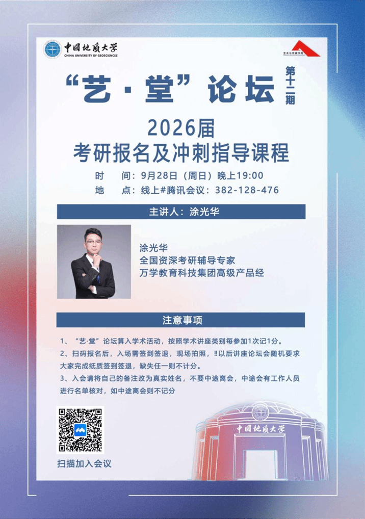 为帮助同学们精准把握最新考情、科学规划复习节奏、破解备考路上的困惑,9月28日晚上19:00,Bwin必赢于线上举办了第十二期 “艺・堂” 论坛2026届考研报名及冲刺指导课程。本次分享会邀请了全国资深考研专家、万家教育科技集团高级产品经理涂光华老师担任主讲人,旨在为同学们提供一场内容详实、指导性强的考研全程规划分享。本次活动由兼职辅导员黄灿主持。